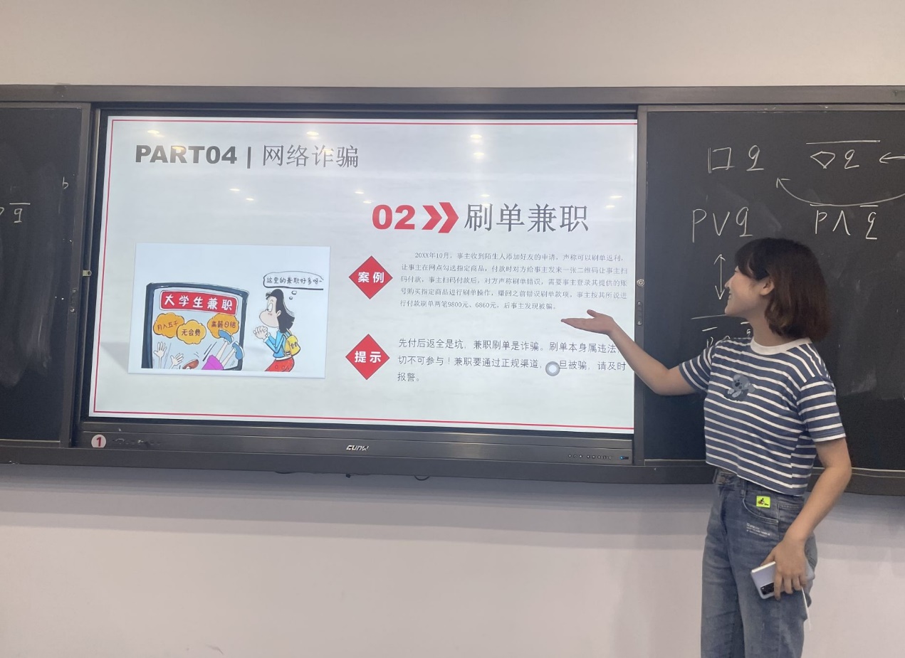 班会进行中,同学们认真地听着班长祎琛的知识讲解,并积极参与互动。既有讲授,也有提问,同学们积极讨论,班会的氛围十分热烈。“高警惕、多防范、少轻信、勿上当”是防范诈骗的不二法门。诈骗具有多种方式,但常见的有4类:电信诈骗、贷款诈骗、赌博诈骗和网络诈骗。无论诈骗具有多么不同的形式,其本质主要是依赖“天上掉馅饼”的心理。同学们只要在日常生活中对“意外获利”保持警惕和防范,不轻信对方的一面之辞,我们就能基本避免成为诈骗的受害者。
