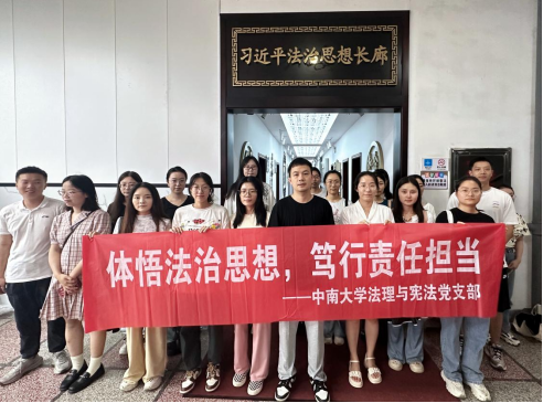 2024年6月19日上午,中南大学法理与宪法党支部组织开展以“体悟法治思想,笃行责任担当”为主题的实践教育活动。支部组织师生党员参观、学习习近平法治思想文化长廊,亲身感受习近平总书记的领袖魅力和人民情怀。