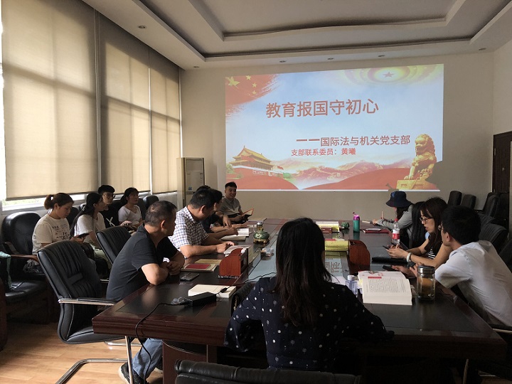 9月25日下午,国际法与机关党支部在法学院207邀请了联系本支部的党委委员黄曦副书记为全体党员上了一堂题为“教育报国守初心”的党课。黄书记从三个方面进行了阐述:全面提高教育质量,多措并举努力形成有利于创新人才成长的育人环境;培育和践行社会主义核心价值观的内容,教师应在社会主义核心价值观教育中发挥榜样示范作用;扩大教育对外开放,新时代国际教育交流合作肩负着更加重大的使命。