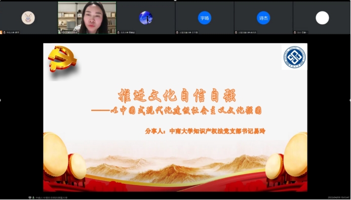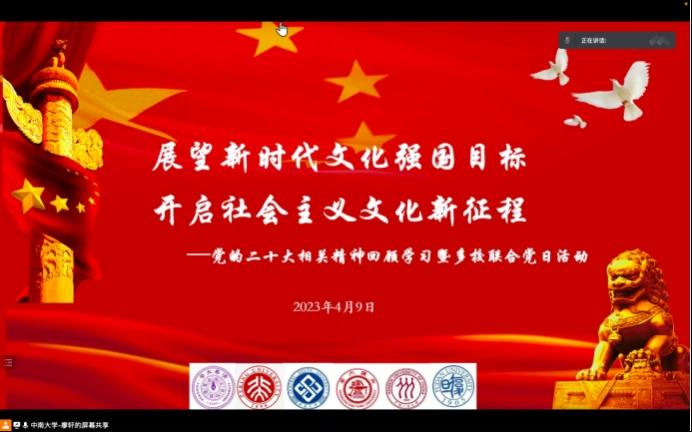为深入开展学习贯彻习近平新时代中国特色社会主义思想主题教育,准确把握党的二十大报告关于文化强国建设的理论,4月9日中南大学法学院知识产权法党支部联合北京大学法学院2022级法律硕士(非法本)第三党支部、上海交通大学教育学院专硕22级党支部、中国人民大学法学院2022级法律硕士(涉外)党支部、北京大学马克思主义学院2022级硕士生党支部、北京大学马克思主义学院本科生党支部、清华大学博士生讲师团、复旦大学博士生讲师团开展“展望新时代文化强国目标,开启社会主义文化新征程——党的二十大相关精神回顾学习暨多校联合党日活动”。