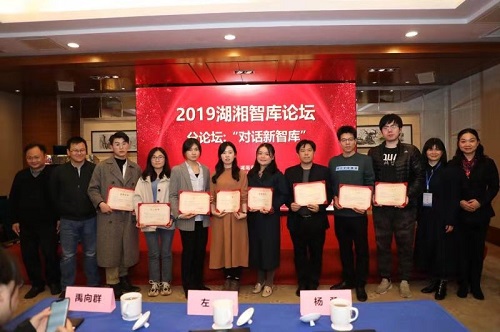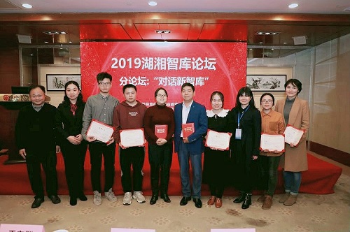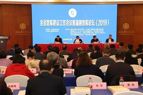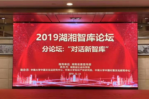 2019年12月14日,由中共湖南省委宣传部指导、湖南省社会科学院主办的全省智库建设工作会议暨湖湘智库论坛(2019)在长沙召开。论坛以“文化产业园区与文化强省建设”为主题。省委常委、省委宣传部部长张宏森出席开幕式并讲话。省委宣传部常务副部长蒋祖烜、省委宣传部副巡视员刘学、省社会科学院党组书记、院长刘建武以及各市州委宣传部分管社科理论工作领导及省内外相关专家学者参会。会上公布了湖南省第二批智库领军人才、首批智库青年拔尖人才名单并颁发证书。中南大学中国文化法研究中心、知识产权研究院以及中国村落文化研究中心三家专业特色智库联合成功协办了“对话新智库”分论坛。