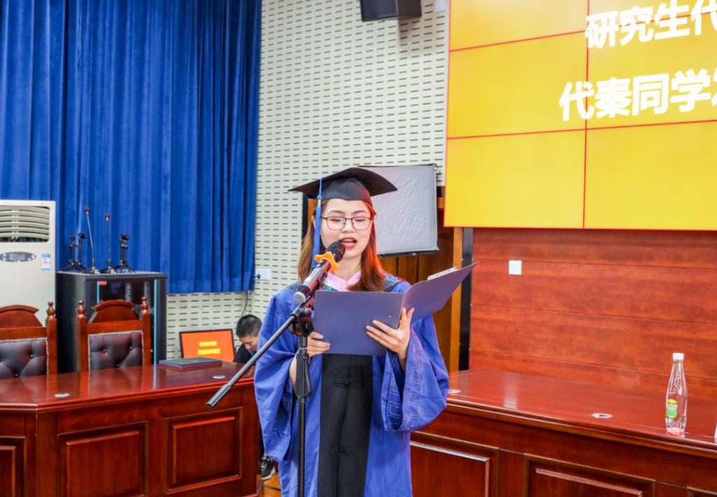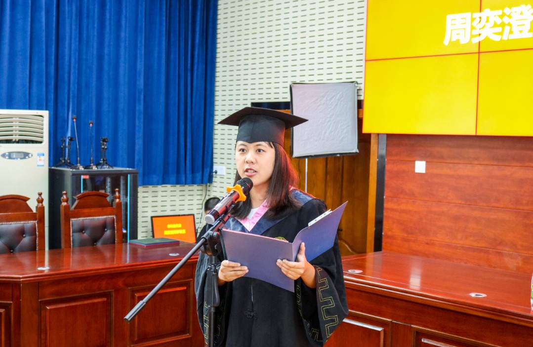 紧接着2016级研究生代秦同学以“认识自己,勇敢向前”为题作了发言,她深情回忆了自己在中南生活的点滴,分享了自己的求学体悟,并对法学院的培养表示了感谢。2015级本科生周奕澄同学以成长为关键词,讲述了自己在大学期间寻找自我,勇敢试错以及坚持不懈的成长过程和成长故事,并对法学院和毕业生们表达了感谢和祝福之情。