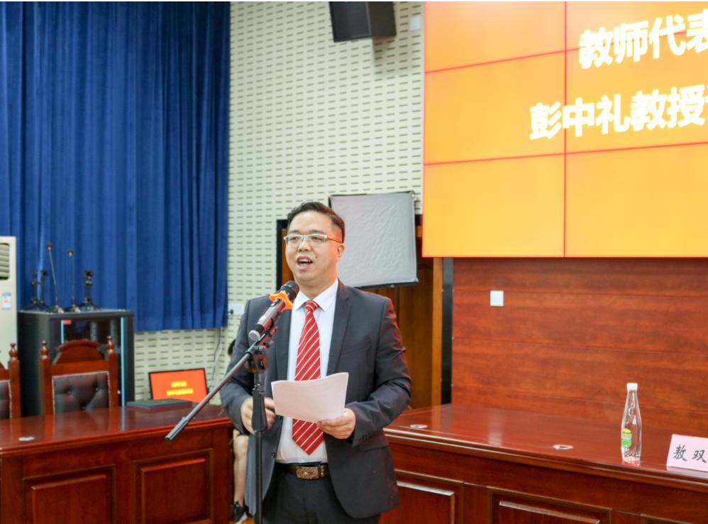 随后,教师代表彭中礼教授以 “喧嚣深处,细碎生活,坚守法治初心”寄语毕业生,他从自己的经历出发,分享了深刻的生活体悟。他希望广大毕业生能够坚守平凡每一天,坚守细碎每一天,坚守奋斗每一天,在今后的生活中认真体会普通人、法律人和追梦人的生活真谛。