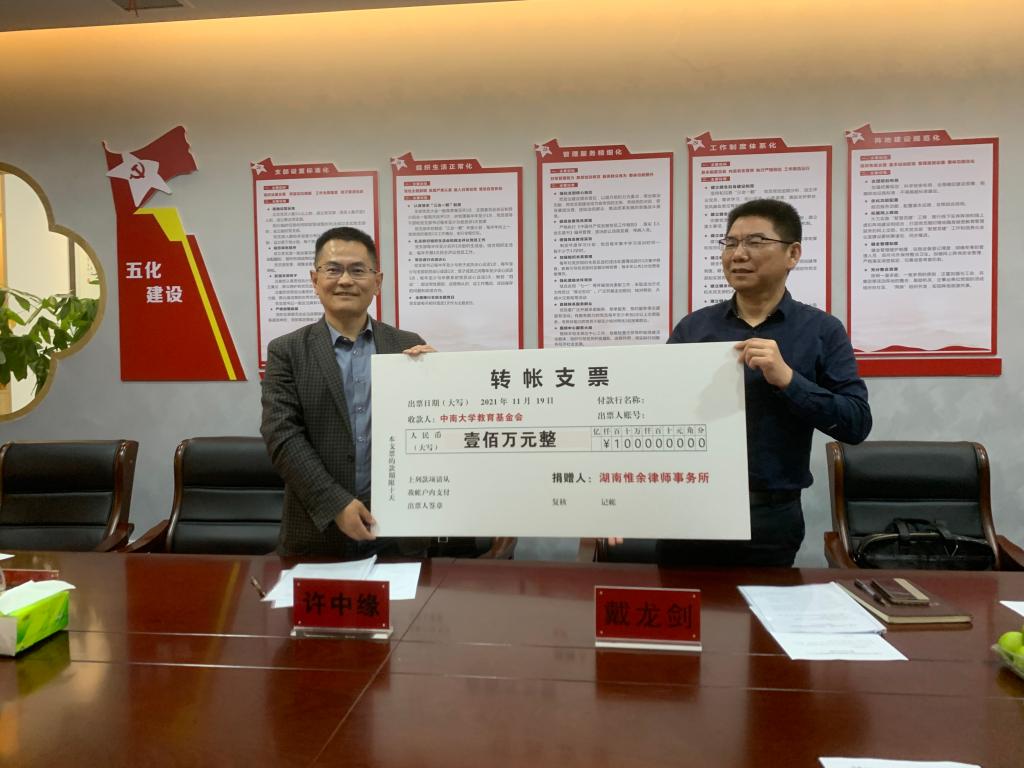 在捐赠仪式上,许中缘院长做了热情洋溢的讲话。他指出,湖南惟余律师事务所是一个年轻和充满朝气的律所,律所合伙人均是从法院、检察院、国企辞职,既有丰富司法及办案经验的精英律师,也有不少执业十年以上的优秀律师,还有一批从知名法学院校毕业的青年律师,形成了老中青搭配的律师人才梯队,有着巨大的发展潜力。在惟余律所创业发展初期,能够挤出专项经费,向法学院捐赠办学,体现了惟余律所特别是合伙人的社会责任担当与长远发展眼光,精神尤为可贵。法学院将以此为契机,依托双方联合成立“中南大学法学院民商事疑难案例研究中心”,加强与惟余律所的理论研究、案例分析、教学实践等全方位合作,努力将法学院的学生培养、学科建设、社会服务提升一个新的水平,也助力惟余律所的发展再上新的台阶。