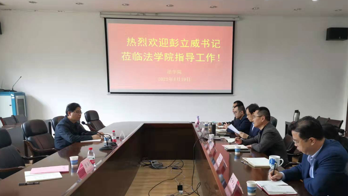 2022年4月19日下午,校党委副书记、纪委书记彭立威一行到法学院调研。学院全体领导班子成员、学院办公室负责人、党委组织干事等参加了会议。会议由法学院院长许中缘主持。