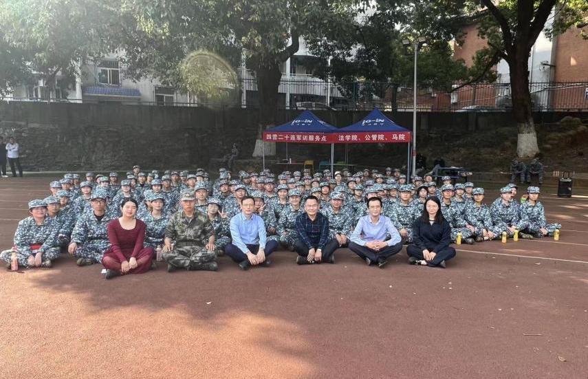 10月21日上午10点至11点,法学院开展了2022级本科新生军训慰问活动。法学院党委书记毛俊响、院长许中缘、党委副书记黄曦,法学院学工办主任李亚萍、分团委书记黎梦、本科生辅导员吴华及2022级辅导员柳思怡,一起看望正在军训的2022级本科新生。