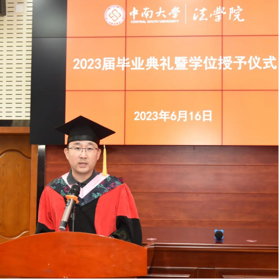 2023年6月16日上午,中南大学法学院2023届毕业典礼暨学位授予仪式隆重举行。法学院党委书记毛俊响,院长许中缘,副院长杨清望、彭中礼,教师代表金大宝、郑泽星,以及院学工办主任李亚萍,辅导员黎梦、吴华等出席了本次典礼。法学院2023届全体毕业生参加了典礼。典礼由李亚萍主任主持。