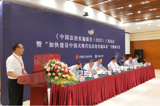 2023年7月8日上午,《中国法治实施报告(2023)》发布会暨“加快建设中国式现代化法治实施体系”专题研讨会在京举行。本次会议由中国行为法学会和中南大学联合举办。会议采取线下线上同步直播形式。全国人大、最高人民法院、司法部和中国法学会的领导莅临并发表讲话;中国人民大学、中央党校、清华大学、中国社科院、北京大学、南开大学、浙江大学、深圳大学、天津大学、中南大学的众多法学专家发表演讲;全国各级各类法律实施机关、各高校及各大媒体代表近百人莅临现场,3500余人在线上参加了会议。