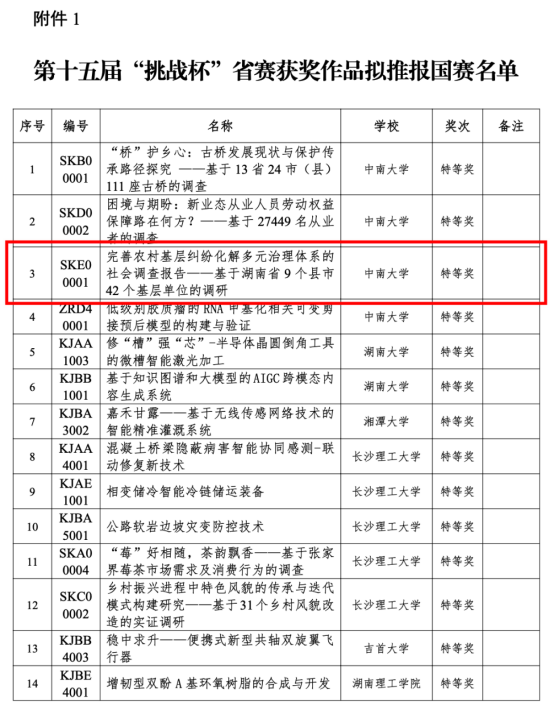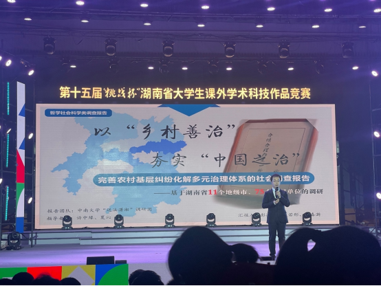 自今年3月“挑战杯”活动启动以来,来自95所院校推报的635件参赛作品进入省级复赛。经过各领域专家学者的严格评审,有181件作品入围省赛终审决赛。经过2天的激烈角逐,中南大学法学院“送法潇湘”团队“完善农村基层纠纷化解多元治理体系的社会调查报告”以优异的表现在百余名队伍中脱颖而出,获得第十五届“挑战杯”湖南省大学生课外学术科技作品竞赛特等奖推送至国赛,并作为社科类优秀作品进行了路演汇报。