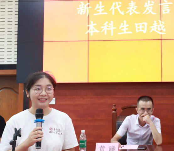 2022级研究生许丁悦作老生代表发言,对新生同学表达了诚挚的欢迎,介绍了中南大学法学院的渊源,提到:用心求学,明责立志,法学院是厚学深思的殿堂;崇德修身,砥砺前行,法学院是锻造自我的熔炉。同时,她对新生同学表达了期许,希望大家在这个有些许浮躁的社会中,仍能保有一个法律人的觉醒、传递法律人的温度、践行法律人的责任,永远目光晴朗、内心滚烫。