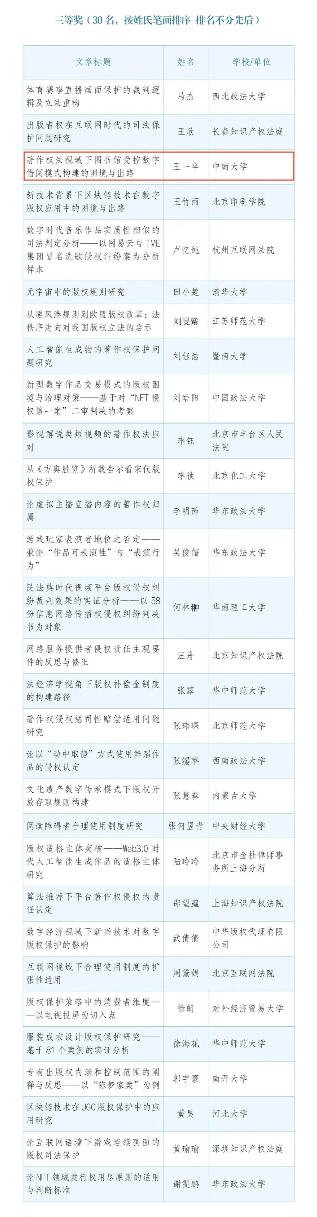 中南大学法学院、中南大学知识产权研究院长期以来积极贯彻落实知识产权强国战略,高度重视知识产权专业人才的教育培养,积极组织学生参加版权征文活动和各类专业竞赛。在本次活动中,再获佳绩。未来,我们将继续深入贯彻落实党中央、国务院关于知识产权强国建设的战略部署,培养更多堪当强国建设重任的时代法治新人,为推动新时代全面依法治国重大战略贡献力量。