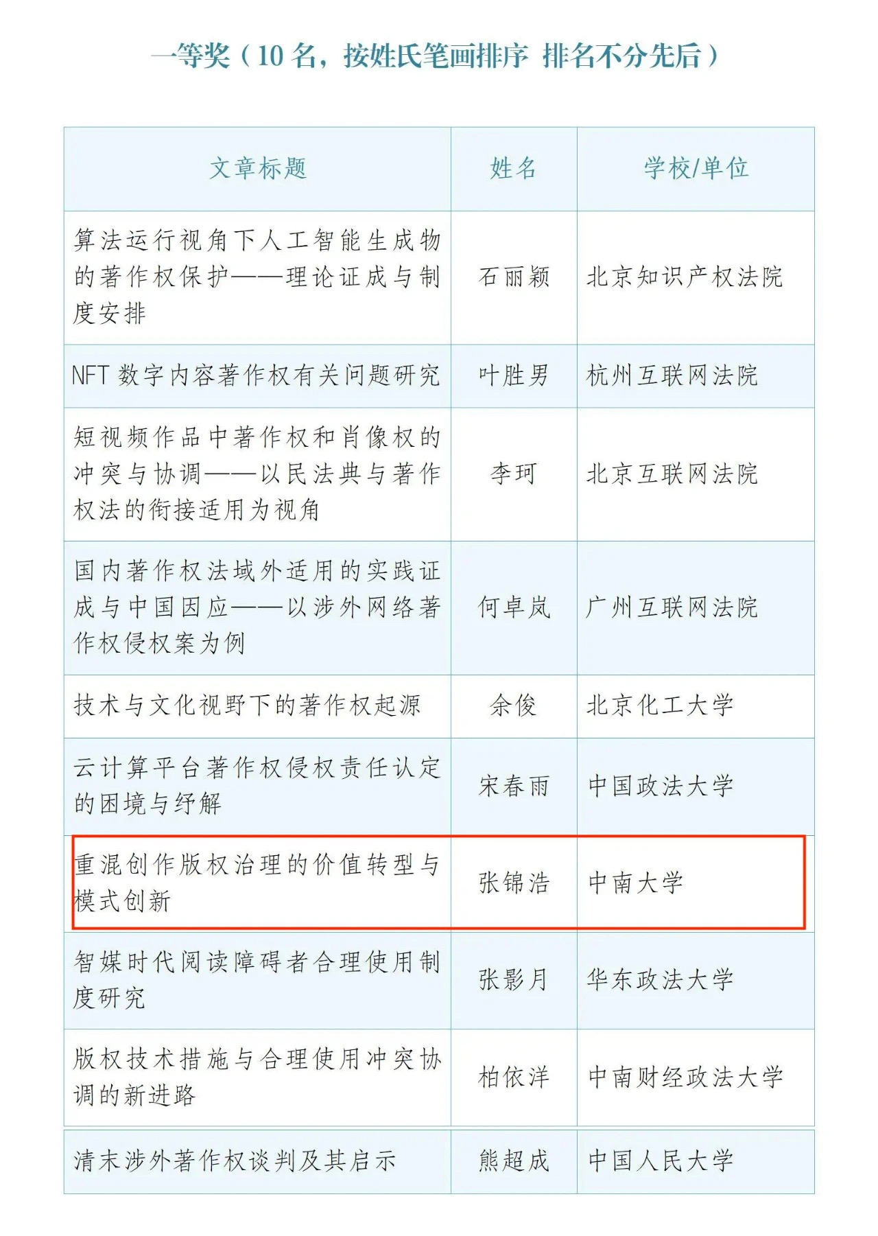 在第五届新时代版权强国青年征文活动中,中南大学法学院、中南大学知识产权研究院2022级硕士研究生张锦浩荣获一等奖,2019级博士研究生王一卒荣获三等奖。