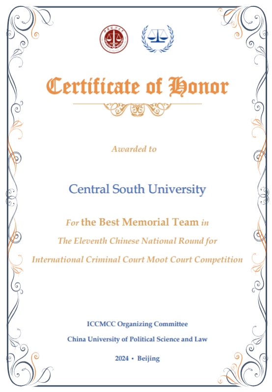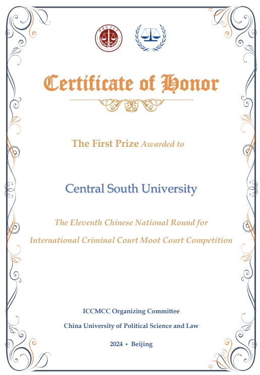 2024年3月24日,第11届国际刑事法院模拟法庭(ICC)英文赛落下帷幕,中南大学代表队经过两天的高强度比赛,勇得全国一等奖,并获得“最佳书状”的荣誉!