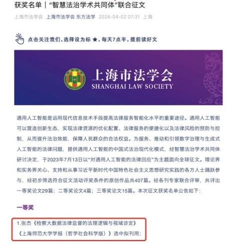 近日,“智慧法治学术共同体”公布2023年联合征文获奖名单,我院张杰教授撰写的《检察大数据法律监督的法理逻辑与视域诊定》与2022级宪法学与行政法学专业博士研究生马欢(指导老师:徐靖教授)撰写的《教育“数字”歧视的规制逻辑:从技术理性、价值理性到制度理性》均荣获一等奖。
