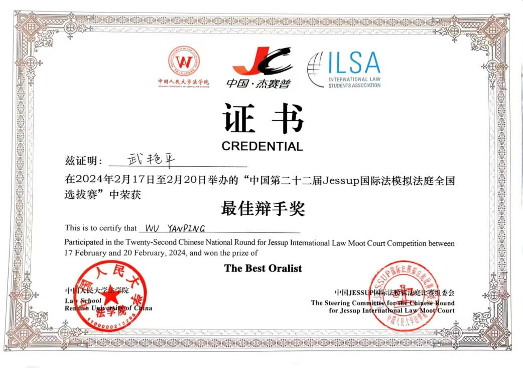 我院杰赛普代表队荣获2024年杰赛普国际赛Alona E Evans Awards全球最佳书状第18名,连续5年获全国一等奖, 2020级本科生武艳平获全国“Best oralist”(第18名)。