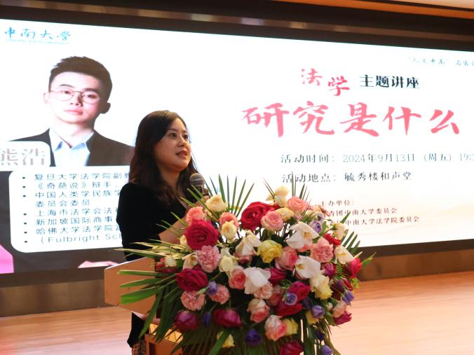 9月13日晚,复旦大学法学院副教授熊浩老师受邀在中南大学毓秀楼和声堂开展“研究是什么”的主题讲座。本次讲座由共青团中南大学委员会、共青团中南大学法学院委员会联合主办,近700名师生参加。讲座由中南大学法学院副教授邓婷婷老师主持。
