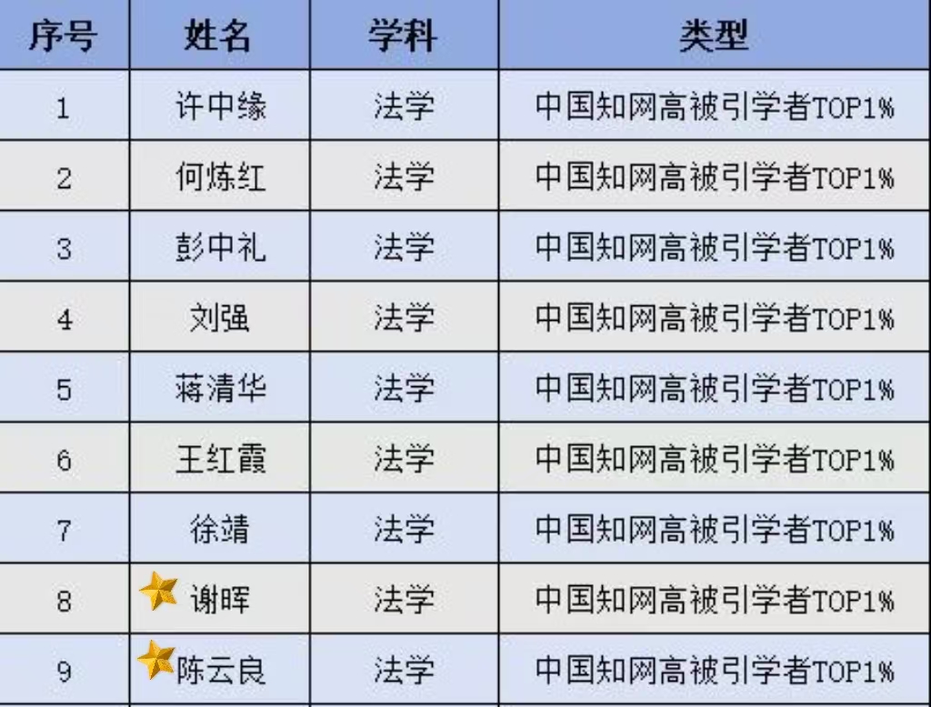 根据名单,中南大学法学院中国知网高被引学者共18人,其中80后学者9人,分别为 彭中礼、刘强、蒋清华、王红霞、徐靖、毛俊响、易玲、张新平、徐琳,90后学者3人,分别为夏沁、王健、郭壬癸。高被引学者占比达到在职教师的30%,充分体现出法学院较强的科研实力。