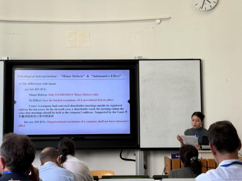 朱钰洁聚焦共同困扰中德两国的股东会决议程序瑕疵问题,以《股东会程序瑕疵决议的效力识别》为汇报主题,开篇扼要提出中国公司法第26条程序瑕疵效力认定条款法律用语的不确定性与多义性。通过回溯公司法的修定历史,分析瑕疵决议效力体系效应,揭示了中国第26条的规范本意,并依据规范目的,对不同瑕疵类型效力识别进行具体化构建。同时,详细比较了德国股份公司法与中国公司法之规定,全面阐释了两国在程序瑕疵制度设计中的相同目标与不同策略。助力两国法律制度的相互学习与交流。汇报后,评议人与朱钰洁博士生展开积极讨论,进一步深化两国在程序瑕疵决议灵活法律效果上的共识与创见。