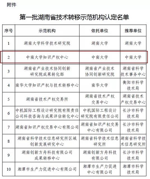 日前,湖南省科学技术厅公布了第一批湖南省技术转移示范机构评定结果,认定了10家机构为首批湖南省技术转移示范机构,中南大学知识产权中心正式获批!