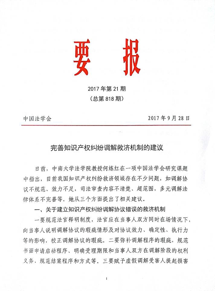 中国法学会《要报》刊登何炼红教授课题组研究成果《完善知识产权纠纷调解救济机制的建议》