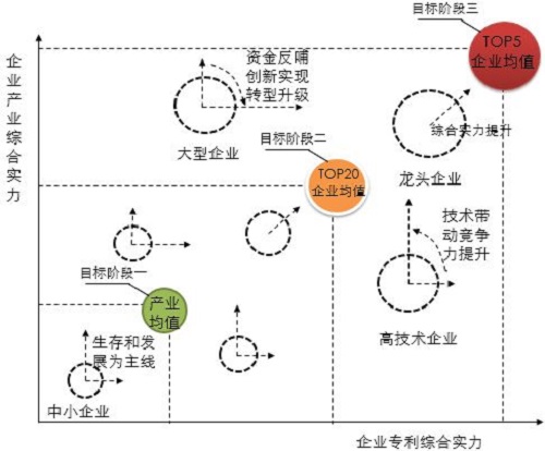 如图3所示,企业发展刚起步时,生存和发展为主线;在积累中成长为行业中等玩家,此时资金、团队基本充裕。若想继续发展为行业中坚,迈入行业前五行列,须在专利综合实力和企业综合实力两方面同步平衡发展,如此,才能又好又快地达成目标。回到XB企业,经调查,XB所处行业排名前五的企业市场总份额接近百分之七十,排名前二十的企业市场总份额高达百分之九十,对于处于行业前二十位的XB企业,若能进入前五,市场份额将大幅提升。