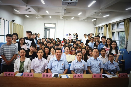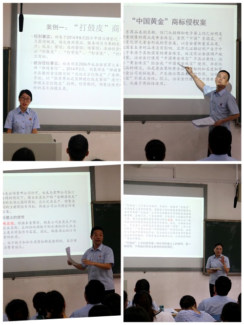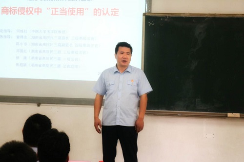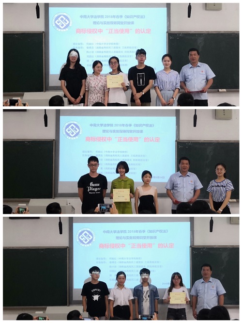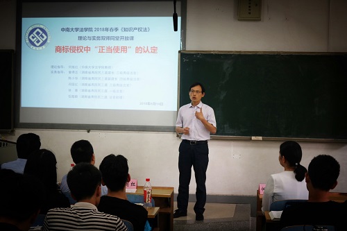 2018年6月14日下午,一堂平常而又别开生面的“理论与实务”双师同堂开放课,在中南大学新校区B座102教室成功举办。说其平常,是因为这是中南大学法学院何炼红教授的一堂日常的《知识产权法》本科生课堂教学,当天是本学期的最后一次课。说其别开生面,是因为课堂的授课老师不只是何教授本人,湖南省高级人民法院民三庭曾得志庭长带领了陈小珍副庭长、邓国红法官、徐康法官、伍超颖法官也一起来到了课堂现场。中南大学法学院的专家教授和湖南省高级人民法院的资深法官联手组成了强大的授课团队,大家围绕 “商标侵权中‘正当使用’的认定”这一主题,和2016级的法学本科生们一起,针对“打鼓皮”商标侵权案、“中国黄金”商标侵权案、重啤公司“水滴图形”商标侵权案涉及的法律知识和争议焦点,进行了热烈的探讨和交流,共同演绎了一堂精彩的公开课。