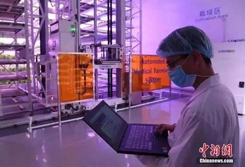植物工厂内,工作人员正在用电脑操作全自动化植物生产线(图源:中新网)