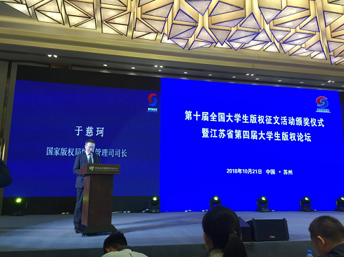 2018年10月21日,第十届全国大学生版权征文活动颁奖仪式在苏州国际博览中心举行。本次活动由国家版权局主办,中国人民大学国家版权贸易基地、中国人民大学创意产业技术研究院承办,国家版权局版权管理司于慈珂司长、中国人民大学创意产业技术研究院彭翊院长、江苏省版权局于国民副局长、江苏省版权协会傅杰三会长以及获奖优秀学生代表、优秀指导老师代表及优秀组织方代表出席此次颁奖活动。