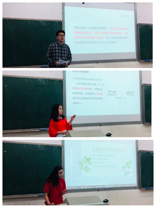 针对商标侵权损害赔偿数额的认定,法学4班王雨煊和杨涵同学介绍了实际损失、侵权获利和许可使用费三种计算方式现有的法律规定和实践中适用的困境。吴唯、刘世杰、李可成和朱钰洁同学介绍了法定赔偿和惩罚性赔偿两种认定方式,并结合新修订的商标法对惩罚性赔偿详细论述。