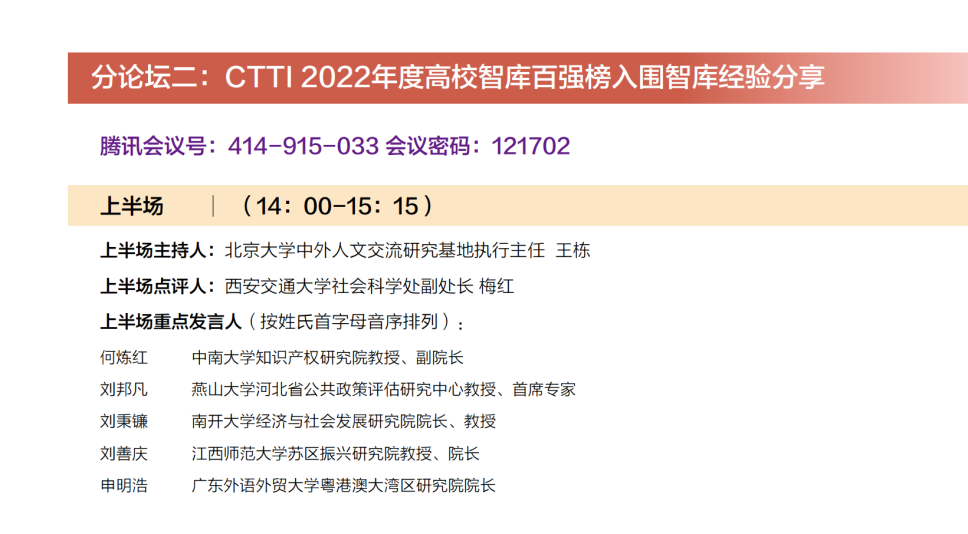 在“CTTI 2022年度高校智库百强榜入围智库经验分享”分论坛中,中南大学知识产权研究院执行副院长何炼红教授应邀以《知识产权强国建设背景下高校专业特色智库建设的路径探索》为主题发言,分享了中南大学知识产权研究院作为高校专业特色智库建设的经验,介绍了知识产权“战略研究+综合管理+技术转移+信息服务”四位一体“中南模式”在服务国家战略和区域经济发展中所取得的成效。