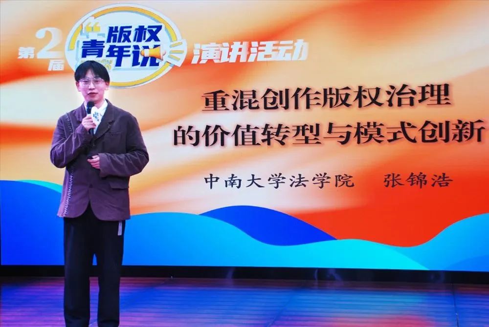 本次活动共邀请了十位来自全国各界的青年才俊,中南大学法学院硕士研究生张锦浩作为本次活动受邀的唯一京外高校学生,以《重混创作版权治理的价值转型与模式创新》为题发表演讲。他以真挚饱满的感情从“重混技术发展引发传统版权治理挑战”、“促进重混创作版权治理价值转型”、“构建重混创作版权治理开放创新模式”三个方面分享了独到见解,展现了新时代版权青年的熠熠风采,表达了对国家版权事业发展的热切关注与衷心祝愿。