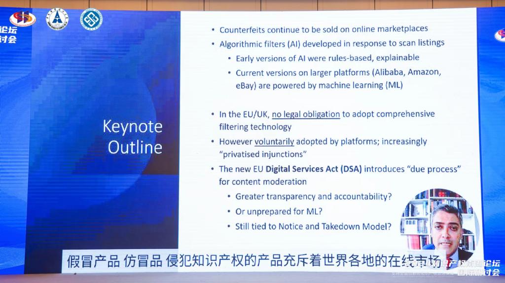 英国牛津大学知识产权研究中心主任德夫·甘吉教授以“全景式品牌保护?机器学习与在线市场”为题,讨论了在线市场中商标和品牌保护的问题。他指出,为解决假冒产品问题,电商平台开始依赖于人工智能过滤技术,并且这些技术已经从基于规则的专家系统转变为机器学习模型,这对法律的适用带来了新的挑战。他进一步谈到,虽然目前的主要的电商平台都在使用这一技术,但是在英国和欧盟这并不是一项法律义务。