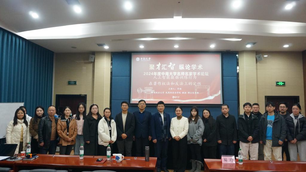 本次讲座是中南大学人事处主办,中南大学法学院、中南大学知识产权研究院承办的“2024年度中南大学名师名家学术论坛”系列讲座之一。李扬教授对人工智能数据训练行为在著作权法和反法上定性问题的精彩分享令人受益匪浅,引导与会师生对于产业政策视角下AI研发中的法政策选择进行审视和思考。本次讲座学习氛围浓厚、学术反响热烈,取得圆满成功。