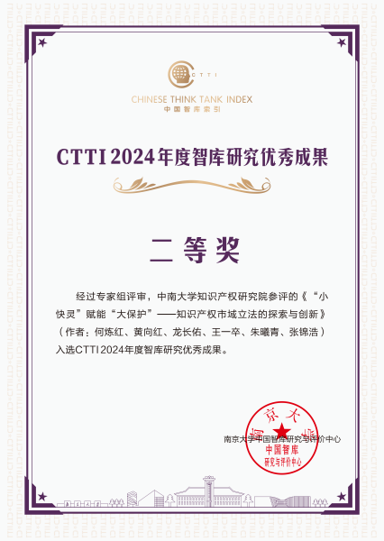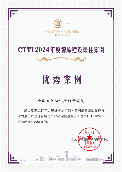 论坛发布了CTTI 2024年度智库研究优秀成果和智库建设最佳案例,中南大学知识产权研究院收获颇丰。其中,成果《强化新型实验室知识产权数据资源利用支撑国家战略科技力量建设》获“一等奖”;《“小快灵”赋能“大保护”——知识产权市域立法的探索与创新》获“二等奖”;案例《专利信息主动服务行业发展,推动创新链与产业链深度融合》获“优秀案例”。