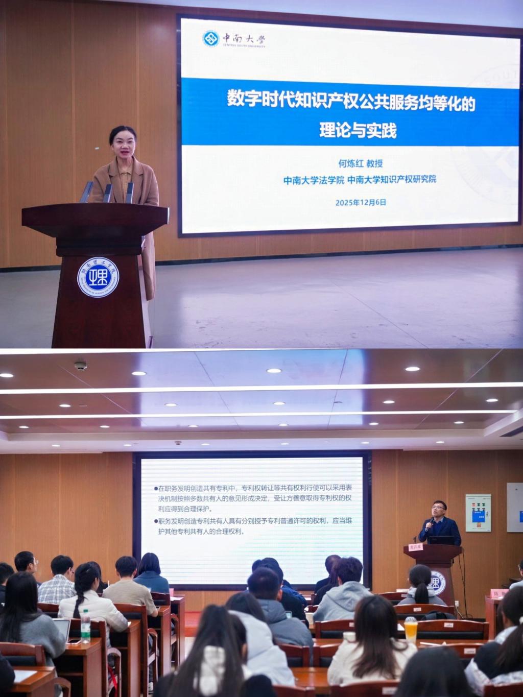 在大会主旨演讲环节,何炼红教授以“数字时代知识产权公共服务均等化的理论与实践”为题作专题报告。她系统阐述了在数字经济与知识产权强国建设背景下,推动知识产权公共服务均等化的重要意义,并结合《知识产权强国建设纲要》与“十四五”规划,分析了当前知识产权公共服务的进展、问题与对策。此外,中南大学法学院刘强教授围绕“职务发明创造专利共有权利行使问题”分享了研究成果,为年会贡献了多元的学术视角与实践思考。