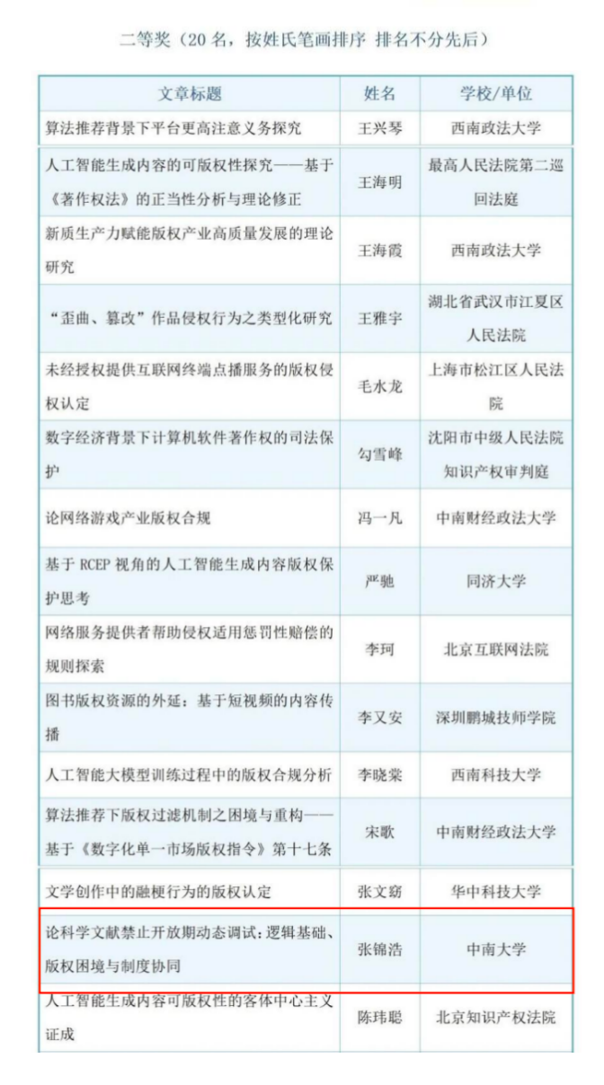 12月17日,由中国版权保护中心指导、中国版权杂志社主办、中华版权服务有限公司协办的“第七届新时代版权强国青年征文活动”评审结果正式揭晓。此次征文活动经过宣传、征稿、初审、终审、公示,最终产生一等奖10名、二等奖20名、三等奖30名、组织奖7名。中南大学法学院博士研究生张锦浩撰写的论文《论科学文献禁止开放期动态调试:逻辑基础、版权困境与制度协同》荣获二等奖。