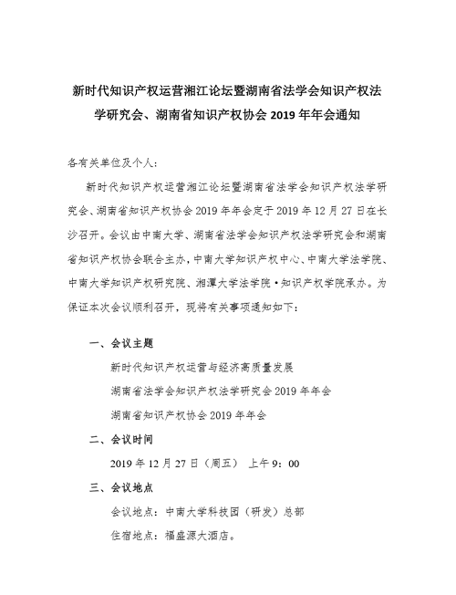 新时代知识产权运营湘江论坛暨湖南省法学会知识产权法学研究会、湖南省知识产权协会2019年年会通知