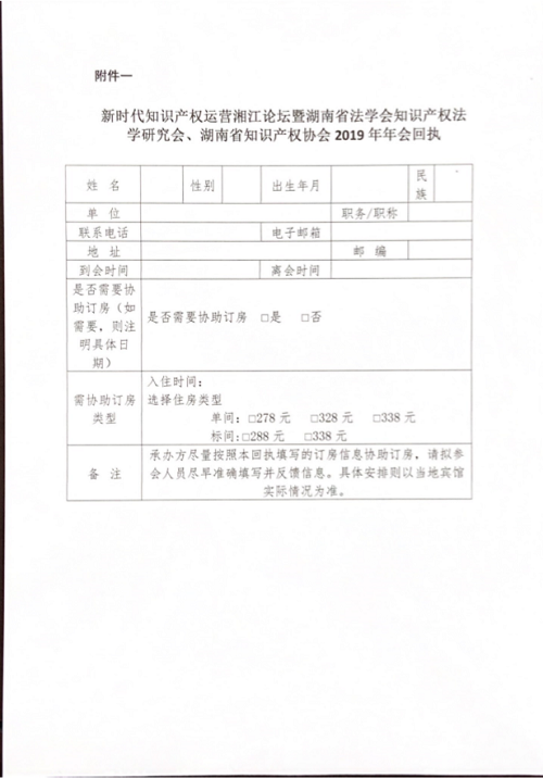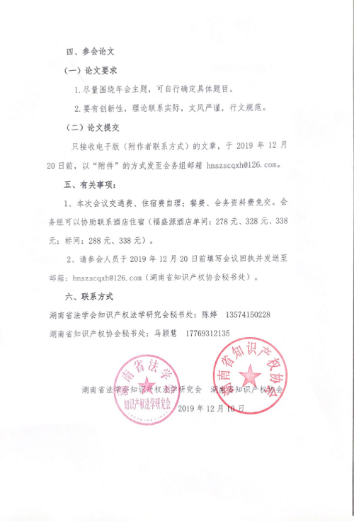 2、请参会人员于2019年12月20日前填写会议回执并发送至邮箱:hnszscqxh@126.com(湖南省知识产权协会秘书处)。