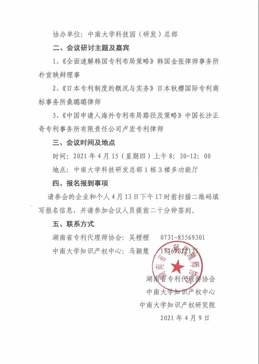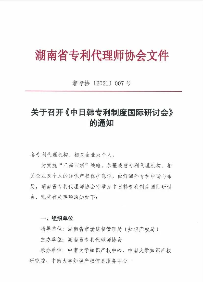 为实施“三高四新”战略,加强我省专利代理机构、相关企业及个人的知识产权保护意识,做好海外专利申请与布局,湖南省专利代理师协会特举办中日韩专利制度国际研讨会,现将有关事项通知如下: